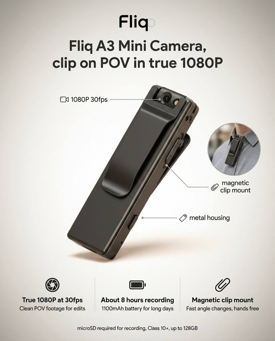The Fliq Pocket Mini Camera is a POV content creation tool for creators who want a small camera they can clip on and trust. It is built for hands free POV, b roll, and multi angle setups, without a bulky action cam workflow or a complicated app ecosystem. You get true 1080P Full HD at 30fps, a magnetic clip mount that attaches in seconds, and a premium metal housing that holds up to daily use.